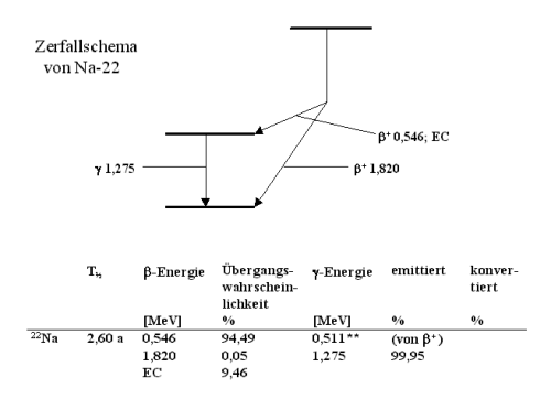 Zieht man zur Orientierung das Zerfallsschema von Na-22 zu Rate, so stellt man fest, dass Na-22 unter Aussendung