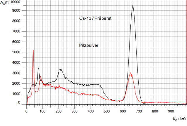 Die rote Kurve im Spektrum zeigt die Analyse von Steinpilzpulver, welches im Jahr nach dem Tschernobyl-Reaktor-Unfall in einem